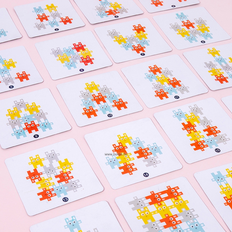 A játék célja: A gyerekek kirakják a kihíváskártyákon látható mintát a színes nyuszi elemekből úgy, hogy azok stabilan megálljanak! Egyszerűnek tűnik? A súlypont és az egyensúly próbára teszi a logikai gondolkodást és a kézügyességet.