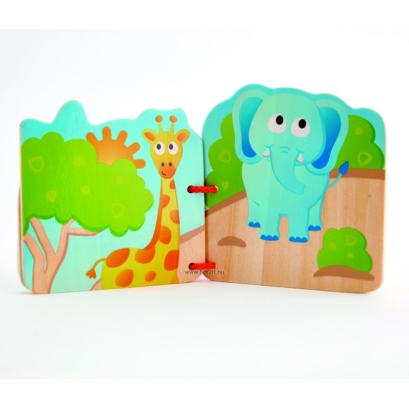 A négy, kétoldalas lapon a következő állatok láthatók: krokodil, majom, oroszlán, víziló egy kismadárral, zebra, zsiráf, és elefánt. A fából készült lapokat egy műanyag zsinór fogja össze, melyen egy fa Hape logó is helyet kapott. ÖNNEK AJÁNLJUK