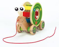 - 1 db mozgatható fejű és farkú fából készült, 4 keréken guruló csiga, 2 csáppal, melyen a szemei vannak.
