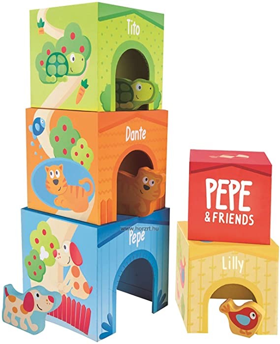 9 db-os készlet mely tartalmaz 4 db fa állatkát (kutyus, cica, teknős, madárka és 5 db erős kartonból készült házikót mely különböző módon, egymásra és egymás mellé is felépíthetők.