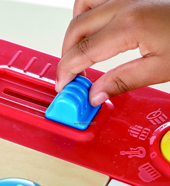 A sárga tekerő gombbal 5 különböző hangszerstílus között válthatnak a gyerekek: zongora, gitár, orgona és dob.