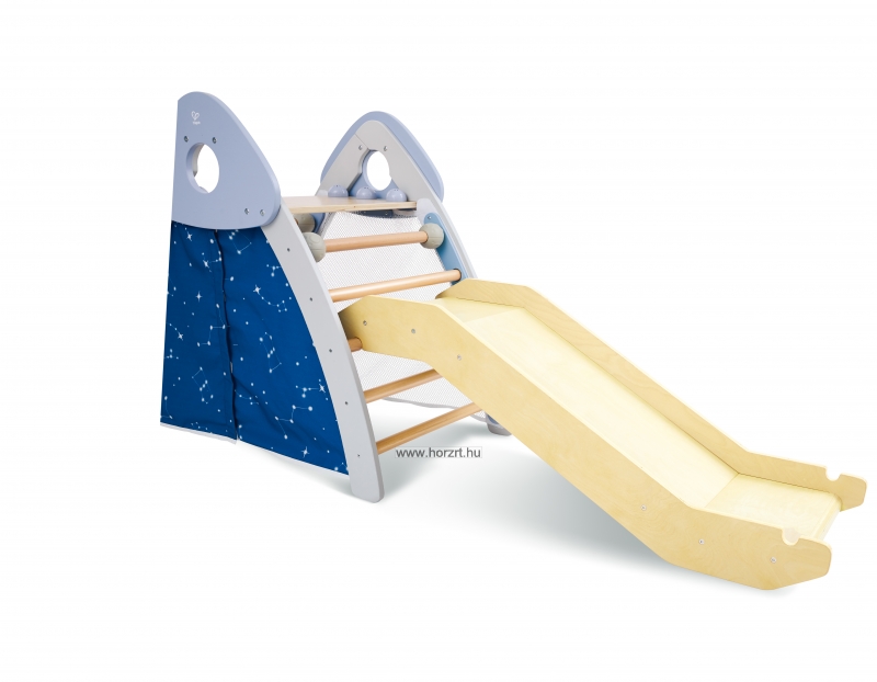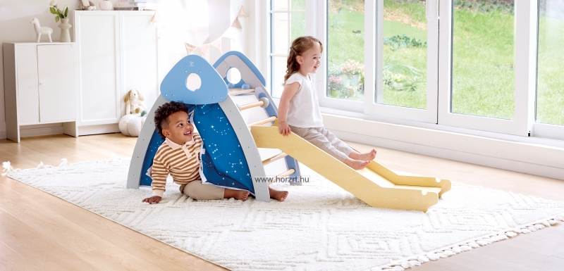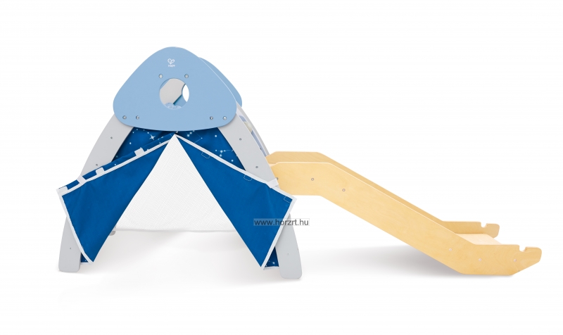 A Hape 4 az 1-ben mászókája egyszerre egy játszó sátor, egy csúszda, egy kis foci kapu és egy beltéri mászóka.