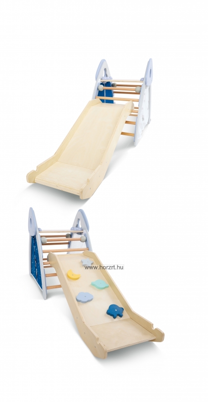 A mászóka csúszda része kétoldalú, így egyik oldala egy sima, csúszda felület, másik oldal pedig egy enyhén döntött mászófal.