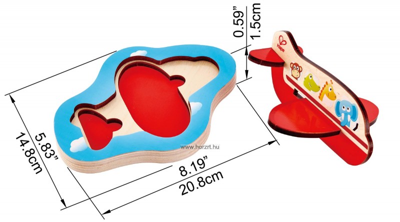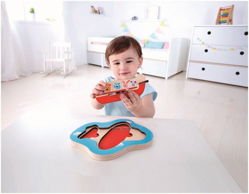 2 rétegű puzzle. Az alsó réteg a szárny és a vízszintes vezérsík, felső réteg a repülőgép test a benne utazó kutya, cica, nyuszi, egérke és elefánt, zsiráf, krokodil, majom rajzaival. A repülő nem csak az alaplapra rakható vissza, hanem össze is építhető 3D-s játékká. 2 éves korú gyermekek használatára CE minősítéssel ellátva!