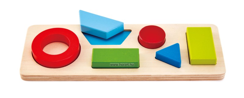 Tartalma: 1 db kétoldalú fa alaplap, 6 db különböző formájú fa geometriai alakzat. 2 nehézségi fokkal: - 1.oldal szín és formaegyeztetés (A piros kör, piros lyukas kör, kék háromszög, kék trapéz, 2 db zöld téglatest). A formák ez adott szín, piros-kék-zöld egy világosabb és egy sötétebb árnyalatára lettek festve. - 2. oldal rész-egész, forma és árnyalatok. (Ezen az oldalon egy kört, egy háromszöget és egy négyzetet kell összeállítani az elemekből.) 18 hónapos korú gyermekek használatára CE minősítéssel ellátva!