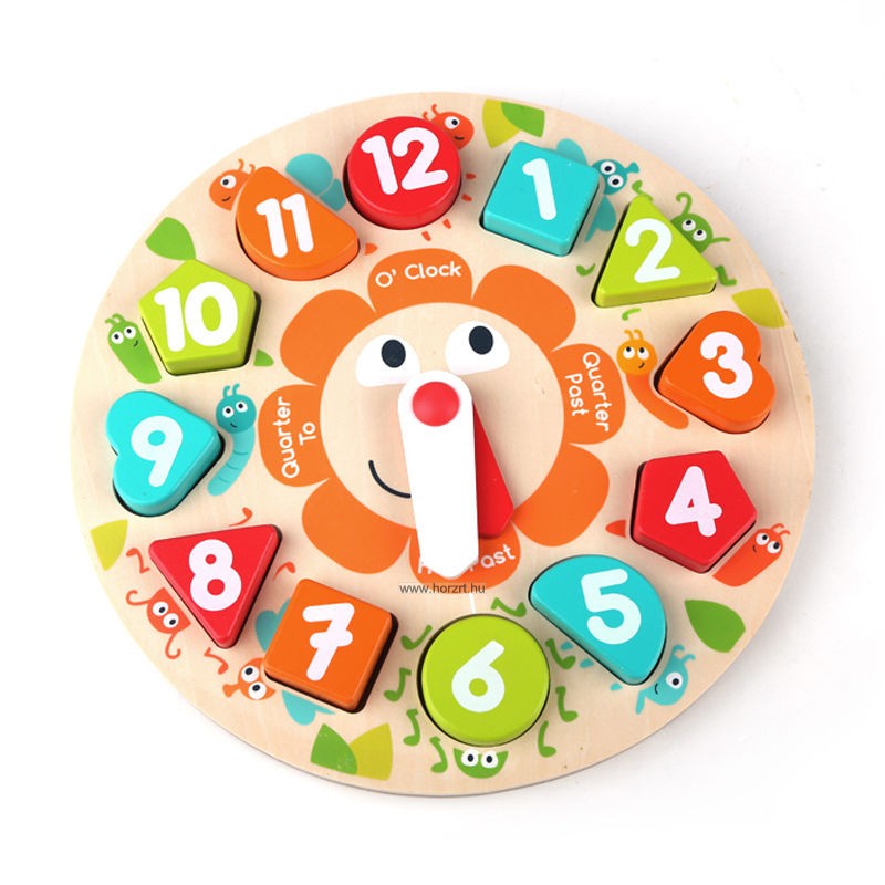 Tanuló óra és formaberakó számokkal. A számok az órán formaberakó játékként használhatók. A körben egymással szemben lévő formák azonos formájúak (kör, négyzet, háromszög, szív, ötszög, félkör. Segítségként az alaplapra a formák alá felrajzolták a megfelelő számokat, így nem csak a megfelelő forma nyújt útbaigazítást a gyerekeknek. Mókás állatkák is díszítik még a játékot: lepkék, csigák, pókok, bogarak. A kis- és nagymutató szabadon forgatható. Az óra számlapja egy stabil kitámasztónak köszönhetően döntve is felállítható. 13 darabos készlet: 1 db számlap mutatókkal, kitámasztóval, 12 db forma, számokkal 1-től, 12-ig.
