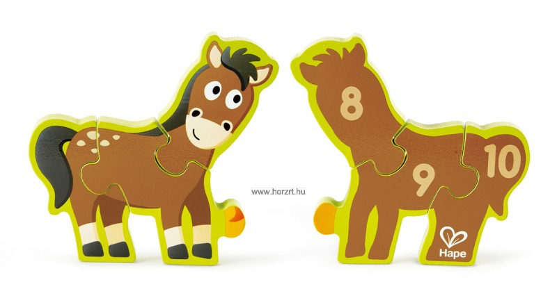 Két oldalas puzzle, melyből a farm állatai rakhatók ki sorban, akár fektetve, akár állítva. Az egyik oldalon az állatok képeivel, a másik oldalon 1-10-ig a számokkal sorban. Tartalma: 10 db puzzle elem, melyen a következő állatok láthatók: lovacska, boci, bárány, nyuszi, kakas
