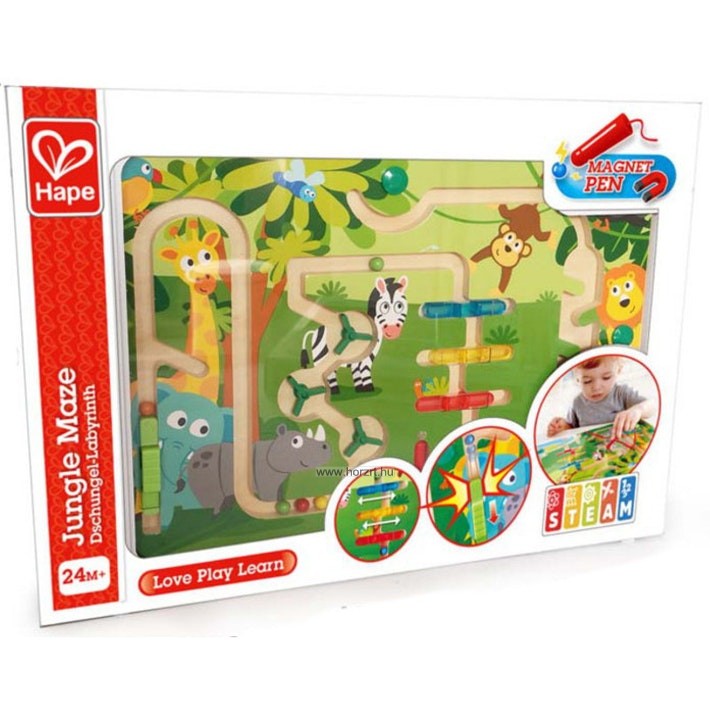 Az alaplap plexivel van lefedve. A mágneses fa pálcika rögzítve van az alaphoz, tárolására egy kis lyuk is ki van alakítva. Fa mágneses golyóvezető, finommotorika fejlesztéshez. A tábla bal oldalán egy kilövő szerkezet, melynek segítségével úgy lehet elindítani a golyót, akár egy flipper játékban. Forgatható és útlezáró elemeket kell leküzdeni, hogy a dzsungel másik végére el tudjuk vezetni a 10 db golyót. 2 éves korú gyermekek használatára CE minősítéssel ellátva!