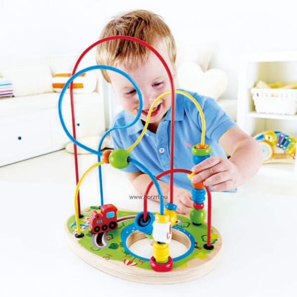 Ez a vidám tekergő fejleszti a szem-kéz koordinációt, az írás- rajzolás készséget is. A piros, sárga és kék kanyargós útvonalakon kell elvezetni a gyűrűket, gömböket egyik végétől a másikig. A talapzaton egy kisvonat mehet ide-oda.