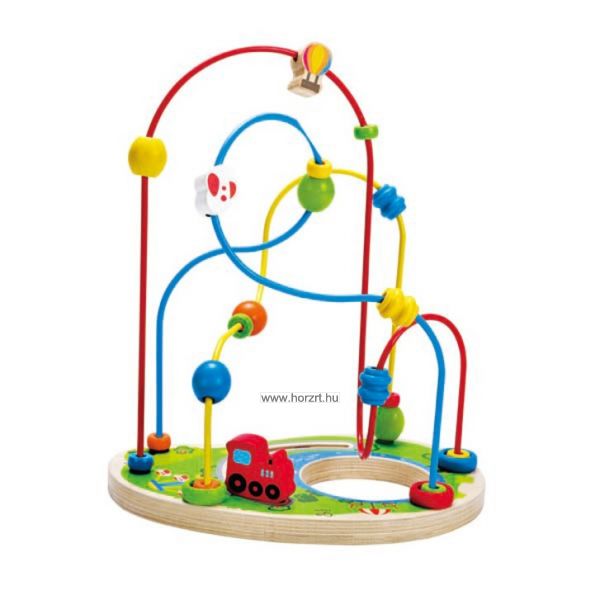 Finommotorikus készségfejlesztő a legkisebbeknek. A játszótér alapzatán egy kisvonat mozgatható ide-oda. 3 fém vonalvezető (piros-kék-sárga), rajtuk egy fa léghajó, egy fa repülő és különböző méretű és színű fa golyók, hogy a picik átvezessék őket a labirintuson. 2 éves korú gyermekek használatára CE minősítéssel ellátva!