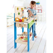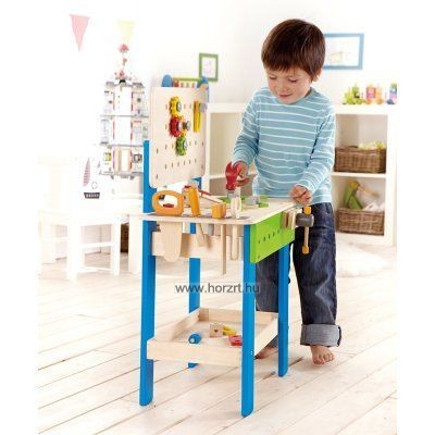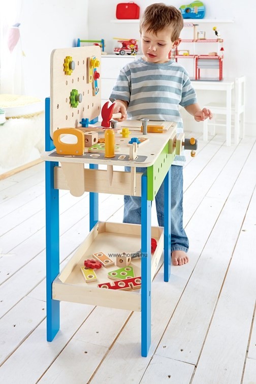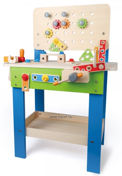 35 darabos készlet. A praktikus asztalka felülete, és oldalai is alkalmasak arra, hogy különböző szerkezeteket erősítsenek rájuk a gyerekeke a csavarhúzóval, vagy a fogóval. Alul egy nagy peremes polcra lehet pakolni a nem használt elemeket, formákat. A munkalap szélén a szerszámoknak kialakított helyük van. A szerszámok (csavarhúzó, villáskulcs, fűrész, kalapács) , a lyukacsos piros, kék, zöld, narancs és sárga színű, több féle alakú formák fából, a csavarok és anyák műanyagból készültek. Fejleszti a kézügyességet és a fantáziát