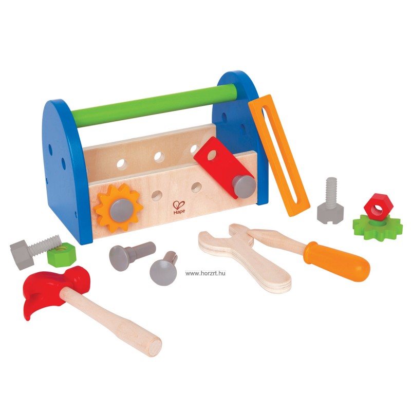 A Hape szerszámosládája természetes, fa anyagból készült, műanyag kiegészítőkkel. A láda, a szerszámok, a lyukacsos formák, fogaskerekek fából, a csavarok és anyák műanyagból készültek. A ládikó fogantyúja élénk zöld színű, magasabb oldalai kék színűek, alacsonyabbak natúrak. Kialakításának köszönhetően az oldalaihoz is lehet kiegészítőekt csavarozni. A készlet összesen 14 darabból áll. Megtalálható benne egy piros fejű kalapács, egy villáskulcs, egy narancssárga nyelű laposfejű csavarhúzó, egy zöld és egy narancssárga fogaskerék, egy piros és egy narancssárga lapos és téglalap alakú elem lyukakkal, illetve egy darab zöld színű, háromszögletű, lyukacsos elem. Ezen felül tartozik a készlethez még egy piros, egy sárga és egy kék színű műanyag csavar, a hozzájuk tartozó anyákkal együtt és kettő szürke színű szög. Anyagának köszönhetően egy masszív és strapabíró játék. A játék mérete: 24x12,8x15 cm, a doboz mérete: 26x14x18 cm.