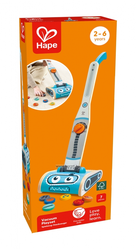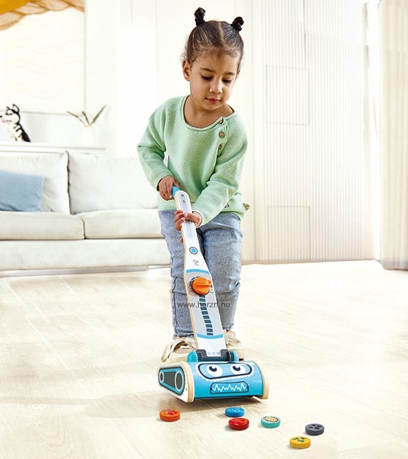 A porszívóval való játék során a gyerekek nemcsak a tisztaság fontosságát tanulják meg, hanem a rendrakás, az önállóság és a szociális készségek is fejlődnek. A szett tartalmazza a porszívót, valamint 6 db apró fa korongot, amelyek „szemetet” szimbolizálják, amit a gyerekek szórakoztató módon tanulhatják meg a hétnapi tevékenységeket.
