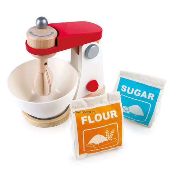 A 4 darabos készlet tartalma: - Robotgép, - Keverőtál, - 1 csomag liszt, - 1 csomag cukor A robotgép felső része billenthető. A habverőt kézzel lehet forgatni a robotgép tetején lévő gombbal. A készletben a fából készült a robotgép, műanyagból keverőtál a liszt és a cukor textilből, szivacs tölltéssel.