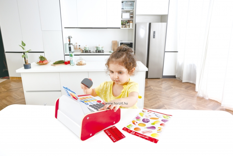 A Hape különleges pénztárgépe minden boltos szerepjáték nélkülözhetetlen kiegészítője. A kis pénztárosok be tudják ütni a megvásárolt termékek árait a pénztárgépbe és így ki is tudják számolni a fizetendő összeget. A pénztárgép különlegessége, hogy a beépített számológép napelemmel működik.