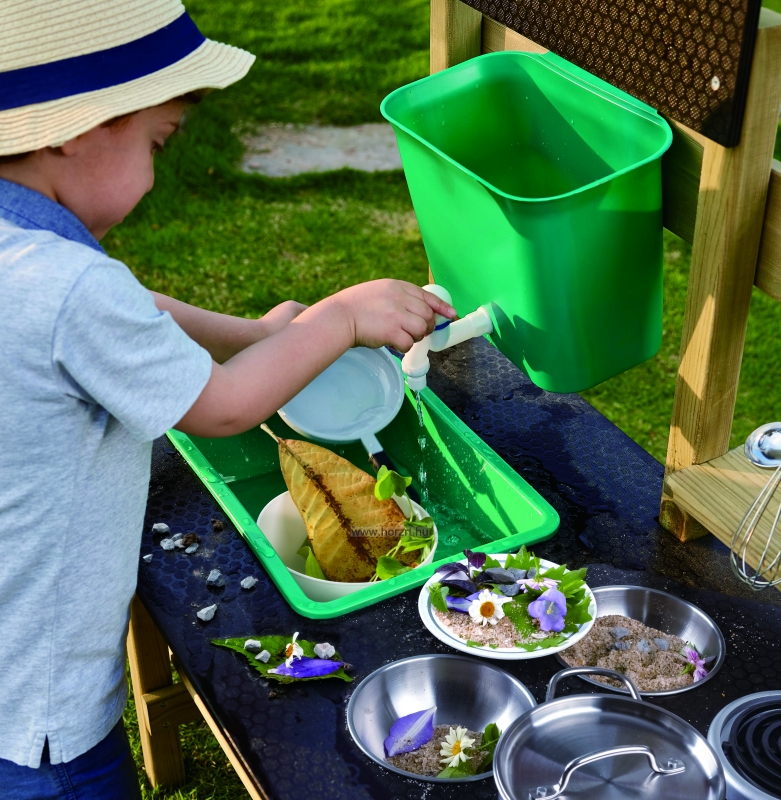 A konyha tetején lévő kis táblára felírhatjuk a napi menüt. A mosogató fölé egy tartályt akaszthatunk, amit megtölthetünk vízzel, így a gyerekek meg tudják mosni a gyümölcsöket és a zöldségeket, valamint elmosogathatnak a főzés, illetve az étkezés után. A mosogató tál kivehető. A mosogató alatt egy nagy tároló polcot találunk, itt tárolhatjuk az edényeket.