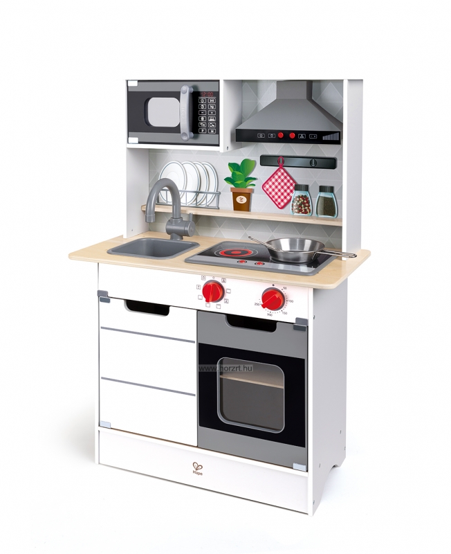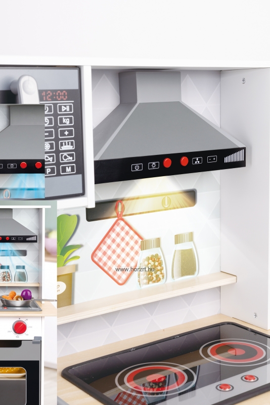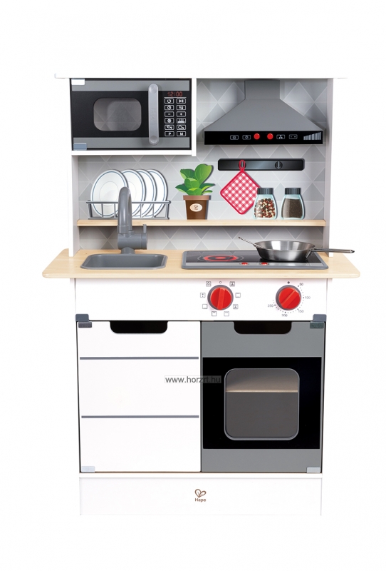Megjelenését tekintve igazán modern, a fehér-szürke-fekete színeit az élénk piros gombok és kiegészítők teszik játékossá. A szerepjátékok tökéletes helyszínéül is szolgáló konyha lehetőséget ad a főzőcskézésre, a vendégfogadásra, de akár éttermes és boltos játékokat is lehet játszani a segítségével. Fény és hangeffektjei még különlegesebbé teszik a játékélményt. A kis bútort használva a gyermekek megtanulhatják a mindennapi életben is fontos kommunikációs formákat és illemszabályokat, ezzel pedig játékosan fejlesztik saját magukat is. ÖNNEK AJÁNLJUK