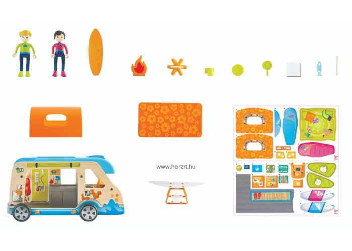 Tartalma: 1 db lakóautó, 22 db kiegészítő elem Tengerparti sportos kalandok, kempingezés, kirándulás mind-mind eljátszható ezzel a nagyszerű lakóautóval. Szerepjátékokhoz ideális kiegészítő. A készletben megtalálható az autó, a fiú és lány figura mellett sátor, tábortűz, farakás a tűz alá, hálózsák, szörfdeszka, sárkányrepülő, 2 db pohár, 2 db tányér, 1 db serpenyő, 2 db nyárs, 2 db hal (nyársra húzható) és matrica szett. Az autó teteje hátrafelé lehajtható, így máris rendelkezésre áll a hullám a szörfözéshez!