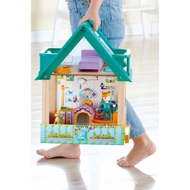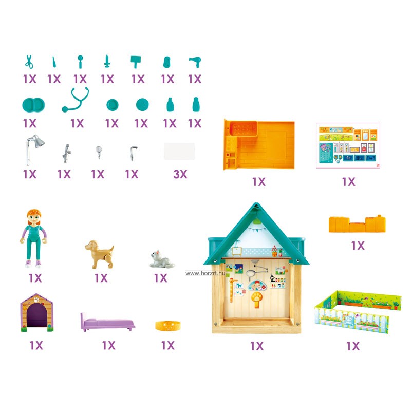 Karton, fa és műanyag elemből készült nagyszerű, hordozható kétszintes állatorvosi rendelő. Felül egy hálószoba a doktor néninek, az alsó részen a vizsgáló, egy kis kert és egy pihenő-fürdőszoba. Kutya-macska figura, kutyaház, etetőtálak, fekhelyek, hajszárító, sampont orvosi eszköz, mind-mind megtalálható a készletben. A hordozáshoz csak egyszerűen össze kell csúsztatni a kertet és a fürdőszobát házzal.