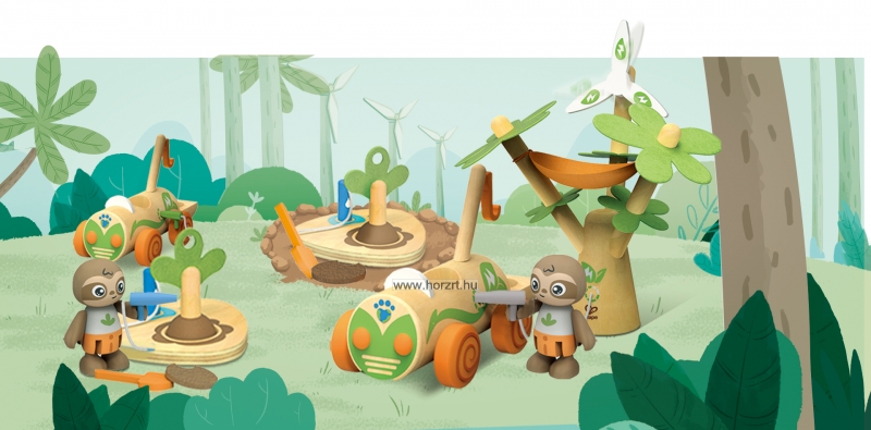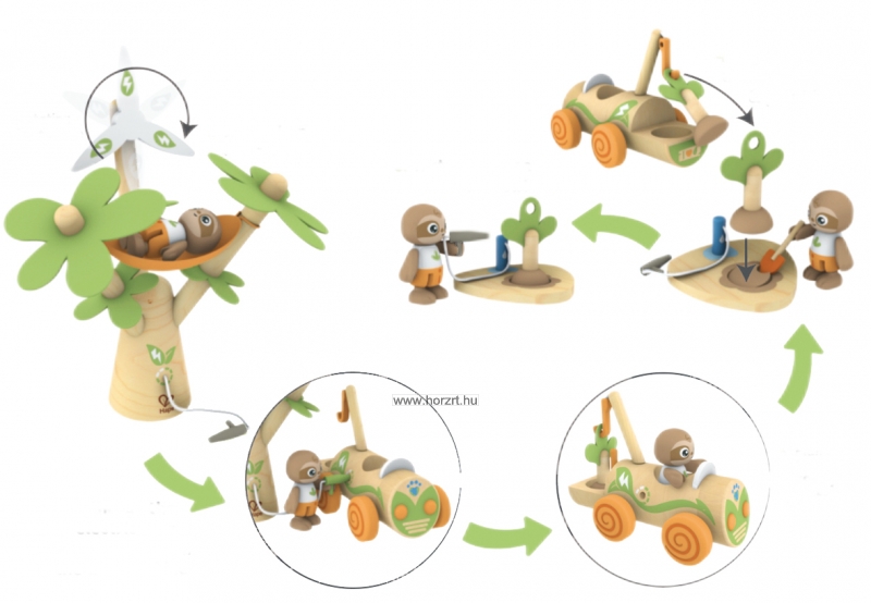 A játék során fejlődik a gyerekek finommotorikája, szem-kéz koordinációja, fantáziája, pozitív hozzáállása a természethez. A készletben találunk egy magas fát, amelyen egy szélkerék és egy függőágy is található. Az elektromos autót ez a szélturbina tölti fel újra, valamint az autó segítségével fákat is lehet ültetni. Az autónak egy daruja és egy kampója is van. Az autó sofőrje egy kedves kis lajhár, aki ha kell gödröt ás, fát ültet és meg is locsolja azt. A munka után pedig a függőágyban töltheti jól megérdemelt pihenését.