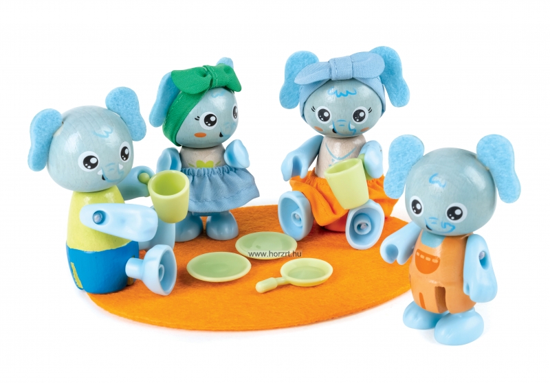 A készlet 4 db elefántfigurát, 1 db szőnyeget, 1 db serpenyőt, 2 db tányért és 2 db csészét tartalmaz. A figurák különlegessége, hogy tudnak ülni és állni, valamint meg tudják fogni a csészéket és a tányérokat is.