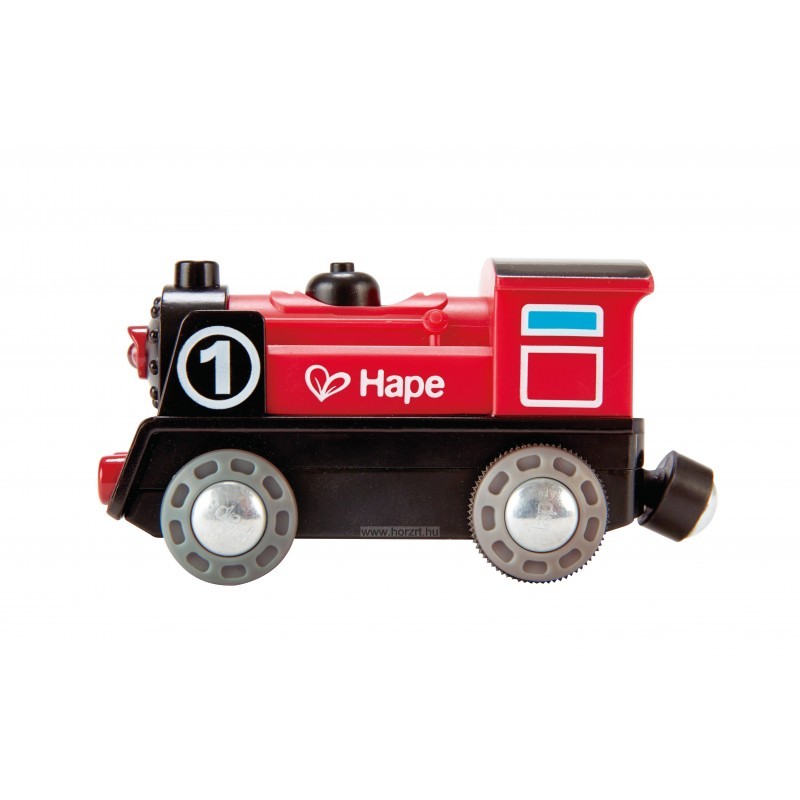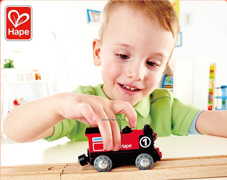 Ez a piros-fekete kisvonat, bekapcsolva önállóan robog a Hape vonatpályákon, vagy terepasztalon.