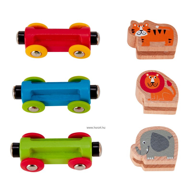- 3 db mágnessel összekapcsolható fából készült négykerekű vagon (piros, kék, zöld színben).