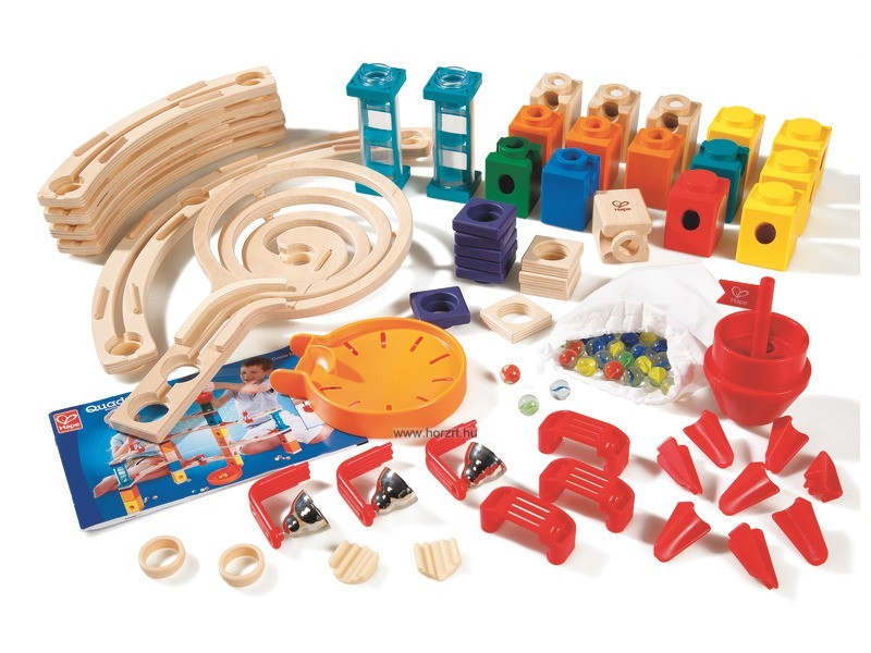 Többféleképpen megépíthető fantasztikus minőségű golyópálya, natúr- és festett fa, valamint műanyag és fém elemekből.