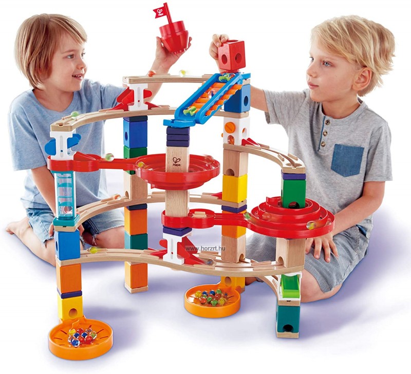 Többféleképpen megépíthető fantasztikus minőségű golyópálya, natúr- és festett fa, valamint műanyag és fém elemekből.