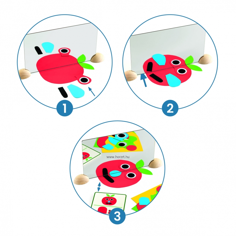 Különleges fejlesztő játék, amely a tükörhasználatra és a vizuális észlelésre épít. A játék célja, hogy a gyermekek felfedezzék a tükör segítségével a képek tükrözött változatait. A gyermekek a tükör alá helyezve a kártyákat, forgatják őket, amíg meg nem találják a képen látható mintához illő tükrözött képet. A játék fejleszti a vizuális figyelmet, a térbeli tájékozódást és a finommotorikus készségeket.