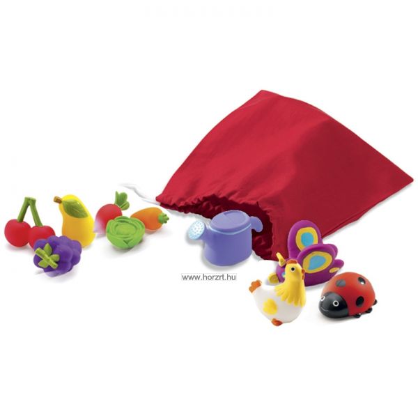 gyümölcsök, zöldségek, állatok, bogarak, eszközök -1 db textilzsák -15 db figura, tanya körüli állat, növény és tárgy (tyúk, nyuszi, bari, talicska, vödör, öntözőkanna, retek, saláta, sárgarépa, szőlő, körte, cseresznye, méhecske, lepke, katica)