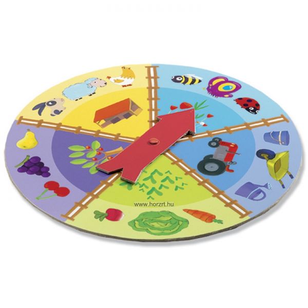 A játék célja: tapogass ki a zsákban különböző, a tanyasi udvaron is megtalálható állatkát, eszközt, gyümölcsöt vagy zöldségeket! Ha pörgettél a keréken, próbáld meg tapintással megtalálni azt a dolgot a zsákban, amire a nyíl mutat!