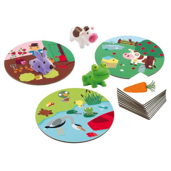 Találd meg gyorsan a nyúl, a béka és a tehén élőhelyét a kártyák segítségével. Egy remek játék a kombinációs készség fejlesztésére.