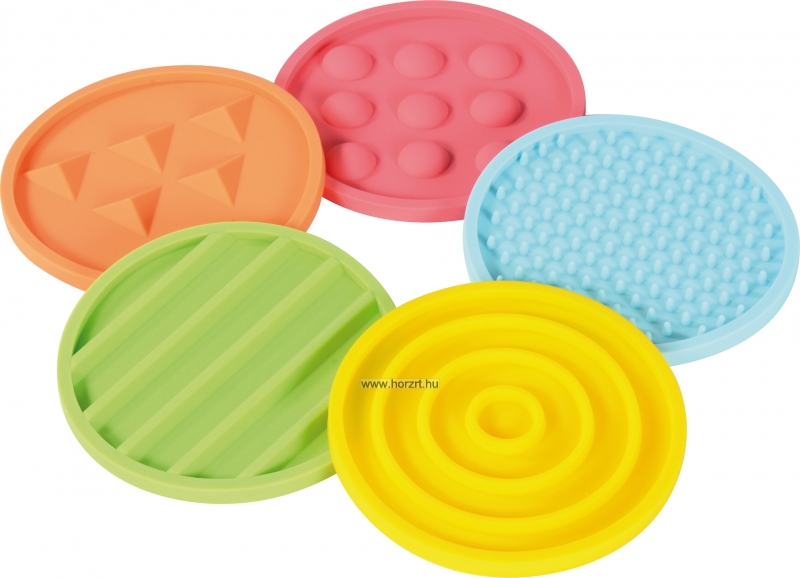 A párosító játék lényege, hogy a gyermekek letegyék maguk elé a földre a nagyméretű szenzoros lapokat, majd csukott szemmel húzzanak a zsákból egy kisméretű körlapot. A feladat, hogy előszőr kézzel kitapintsák a lapokon található domború formákat, majd ha ezt biztosan tudják már, akkor mezítláb sétáljanak végig a nagyméretű lapokon is és ezáltal próbálják megkeresni az azonos felszínnel rendelkező nagy lapot.