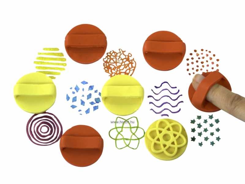A 8 db-os ujjnyomda készlet az alábbi mintákat tartalmazza: virágok, csillagok, körök, buborékok, gyémántok, két féle hullámos vonalak, egyenes vonalak. Ideális használatra kész festékekkel, vagy festékpárnákkal való használatra.