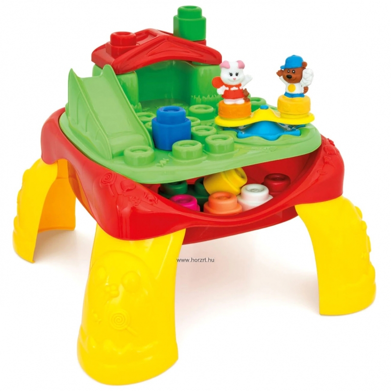 A játszóasztalon egy házikó és egy csúszda is megtalálható, hogy még változatosabb legyen a játék! A zöld fedőlapra lehet építkezni, illetve a játék végeztével az alá lehet elpakolni az építőelemeket. Vidám színeivel, kedves formáival, hamar picik kedvencévé válik.