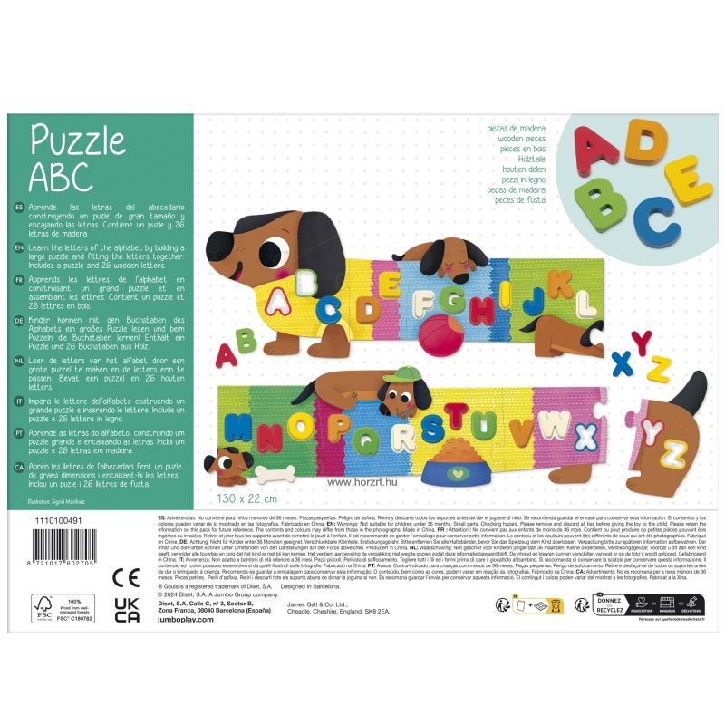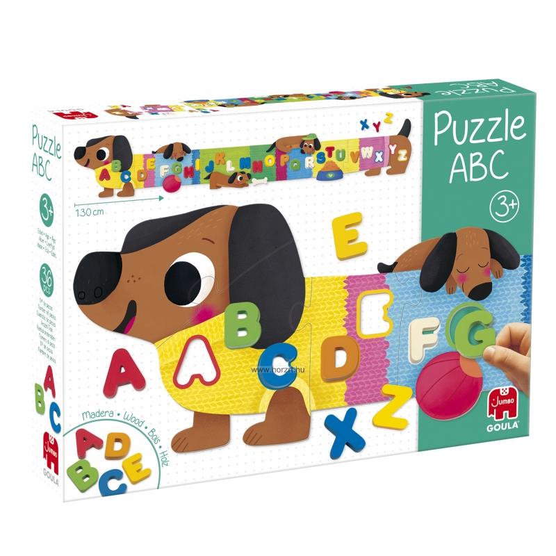 A Goula Tacskó ABC játéka egy szórakoztató és interaktív módja az ábécé tanulásának. A puzzle egy hosszú kutya formájában készült, amelynek testén 26 fa betű található, így a kicsik könnyen összerakhatják az ABC-t. Az XXL méretű darabok ideálisak a kis kezek számára, miközben segítenek a finommotorikus készségek és a kéz-szem koordináció fejlesztésében.