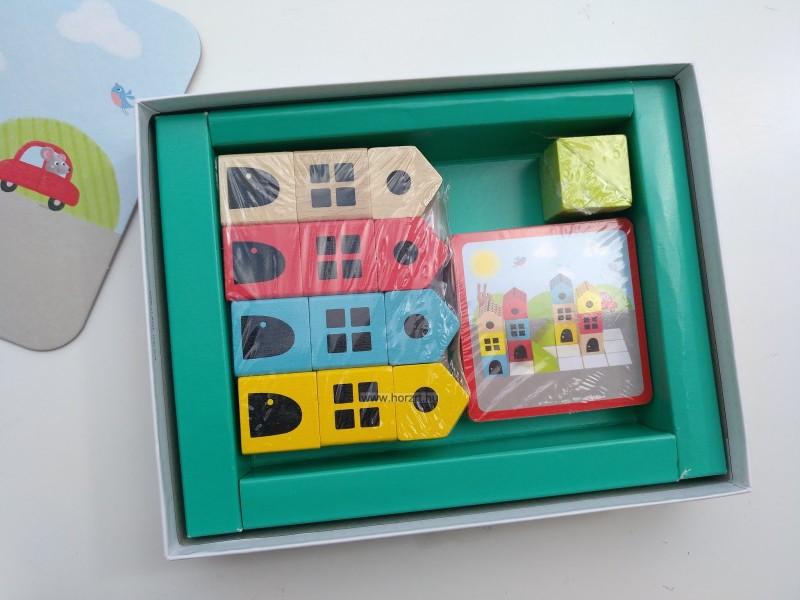 - 14 db 3-4 cm közötti 4 féle színű (zöld, sárga, natúr, piros és kék) fa építőelem
