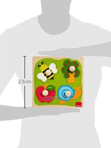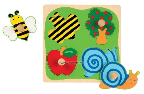 23x23 cm -es alaplapon 4 db nagy puzzle elem található. A kicsik akár a forma alapján is beazonosíthatják, de az alaplapra rajzolt mintázat is segítséget nyújt nekik a méhecske, az alma, a csiga, vagy épp a lombos fa formák helyének megtalálásában.