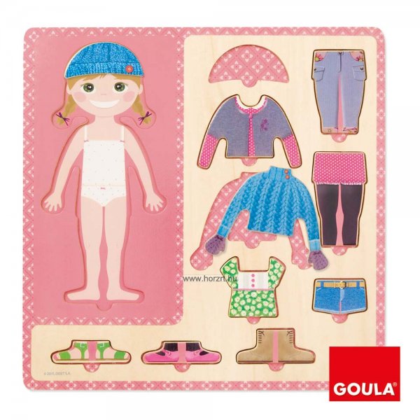 A Goula öltöztetős lány puzzle 10 db élénk színű, fából készült, különböző színű és formájú puzzle-darabot tartalmaz, így a kisgyermekek megkülönböztethetik a különböző ruházatot.