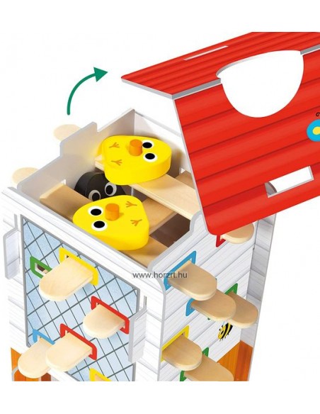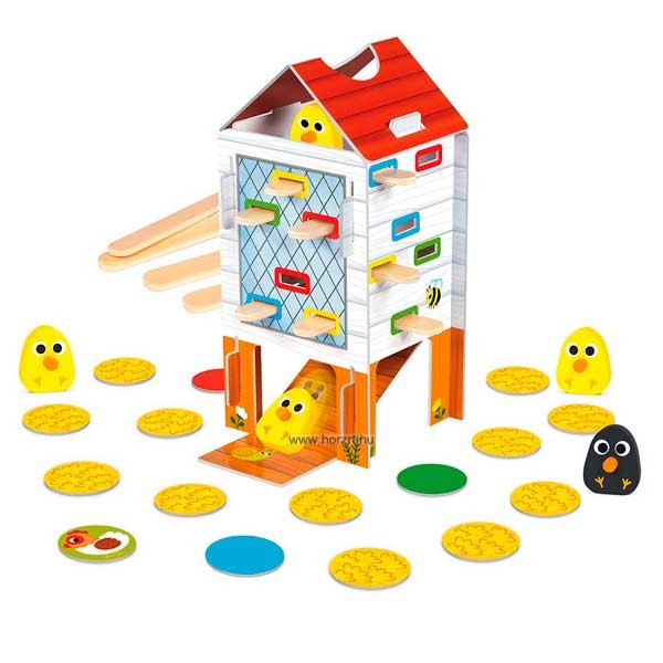 Tartalma: 5 db fa csibe (4 db sárga, 1 db fekete), 12 db fa pálca, 1 db karton tyúkól, 16 db színes karton korong.