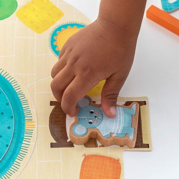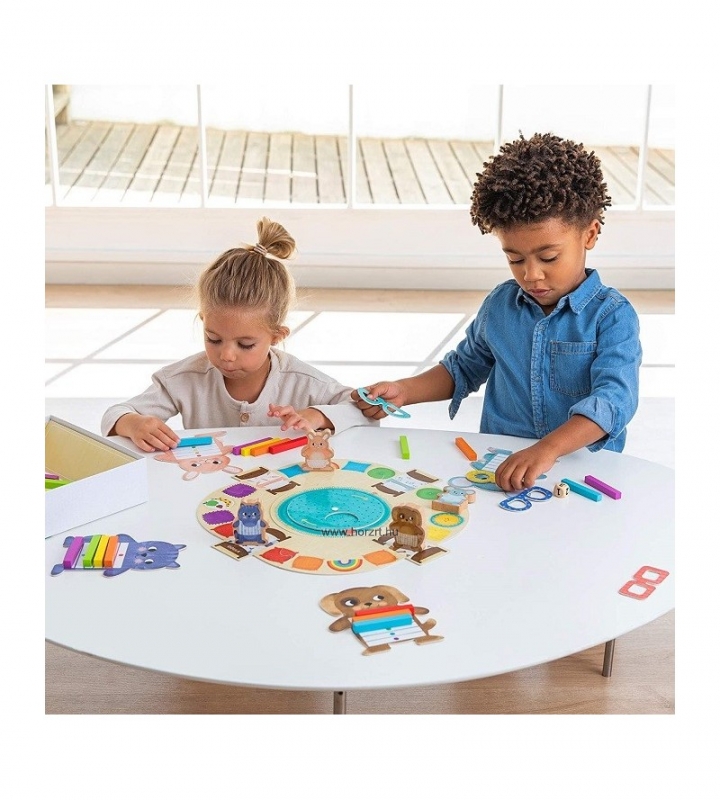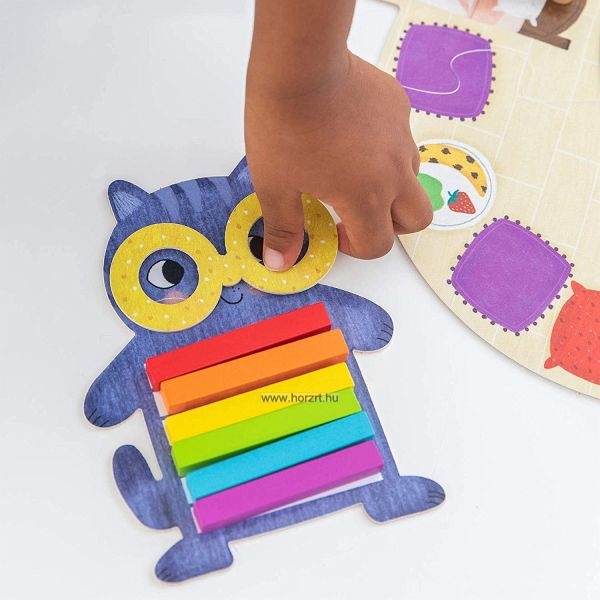 1 db karton játéktábla, 4 db szín jelölő kártya kartonból, 1 db fa dobókocka, 4 db karton állat figura: kutya, egér, cica, nyuszi, 24 db fa színes tégla test-6 különböző színben, 4 db karton, különböző színű játék szemüveg