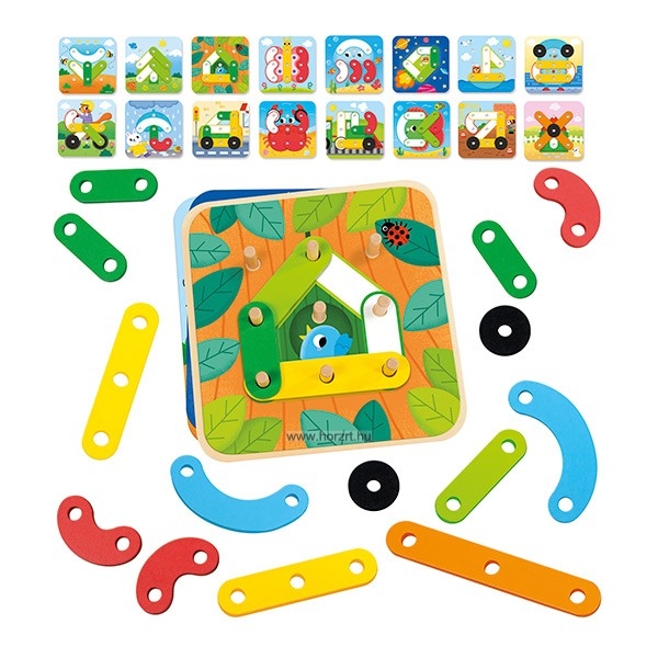 - 22 db fa elem, 6 különböző színben és 6 különböző formában (egyenes, ívelt és kör alakú), melyek a tüskékre illeszthetőek.