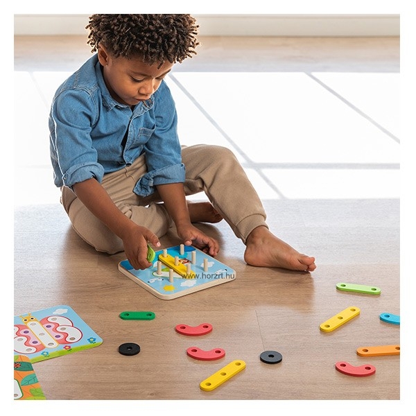 A feladatlapoknak megfelelően helyezzük rá a pálcikákra a különböző színű egyenes, ívelt és kör alakú elemeket.