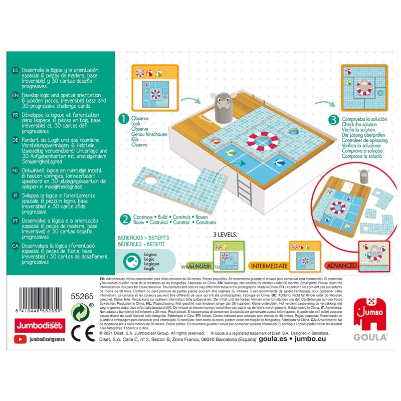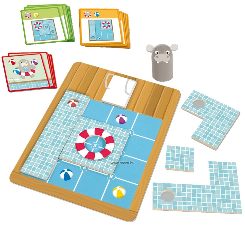 A játék célja: A feladatkártyák alapján a megfelelő elrendezésben, kombinációban a táblára rakni a fából készült elemeket. A játék előkészülete: Miután mindent kipakoltál a dobozból, tedd a játéktáblát a dobozba, a vízilovat az ugródeszkára, a kártyákat pedig a doboz két oldalára! A nehézségi szintek színekkel vannak jelölve: A zöld színű a legkönnyebb, A narancssárga közepesen nehéz, A piros a legnehezebb. Egy játékos esetén: Húzz egy feladatkártyát, nézd meg a rajzot, majd annak megfelelően helyezd el a medencében fából készült, csempe mintás kártyákat. Tedd a vízilovat az úszógumiba. Több játékos esetén: Húzz egy feladatkártyát, helyezd el a darabokat, és ellenőrizd! Ha helyesen csináltad, megtarthatod a kártyát. Az a játékos nyer, aki a legtöbb kártyát összegyűjti 5 kör alatt. Nehezített feladat: figyeld meg a feladatkártyát, memorizáld fél percig, fordítsd le, majd próbáld meg helyesen kirakni emlékezetből. Ez a játékmód még a nagyobbaknak is kihívást jelent!