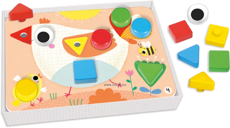 Tartalma: 6 db kétoldalas feladatkártya, 14 db geometriai forma különböző színekben (4 db négyzet, 4 db kör, 4 db háromszög, 2 db kör alakú szem)