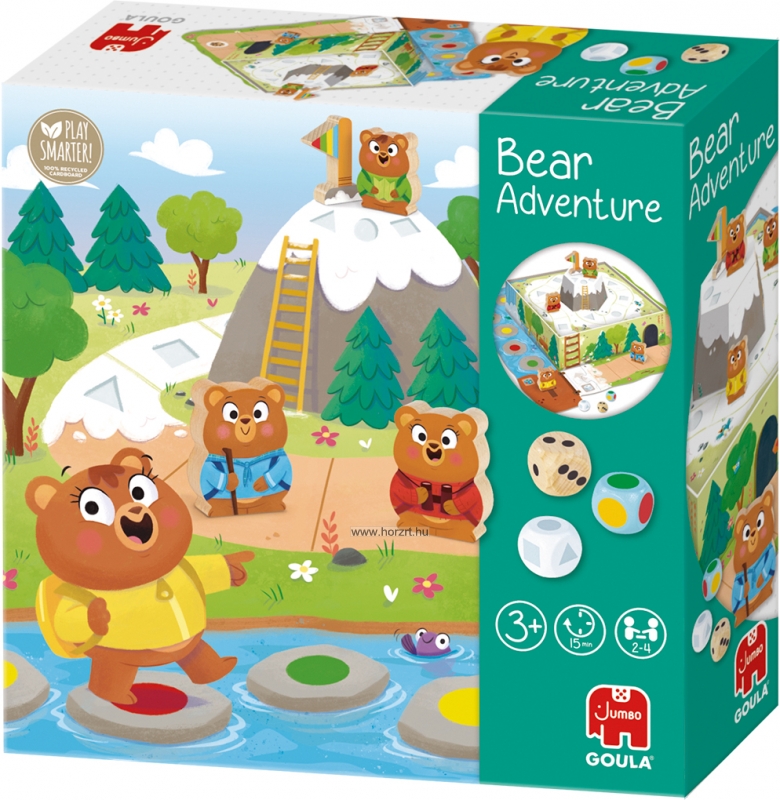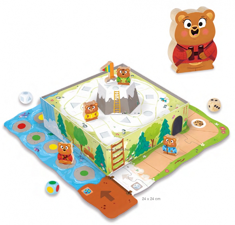 Különleges, 3D-s kialakításának köszönhetően izgalmas kalandokat ígér. A játék lényege, hogy a maci minél hamarabb feljusson a hegycsúcsra és megszerezze a zászlót. Addig azonban hosszú út vezet és különböző dobókockák segítségével kell előre haladni. A játék elején a színes kockával kell dobni, közben megismertetjük a gyerekeket a különböző színekkel. Az út középső részén a pöttyös dobókocka következik, melynek segítségével a gyerekek gyakorolhatják a számlálást. A dobókockán 1, 2, illetve 3 pötty található, a kocka egyik oldala üres. A játék utolsó szakaszában pedig a geometriai formákat ábrázoló kockával kell dobni a gyerekeknek. Ennek során megtanulják a geometriai formák neveit: háromszög, kör, négyzet.. Játék közben fejlődik a finommotorikájuk, a szem-kéz koordinációjuk, figyelmük. Alakul kudarctűrő képességük, szabálytudatuk, formálódnak a társas kapcsolataik. A kiváló minőségű anyagokból készült játék hosszú ideig a gyerekek kedvence lehet. A játék 3 éves kor felett ajánlott.