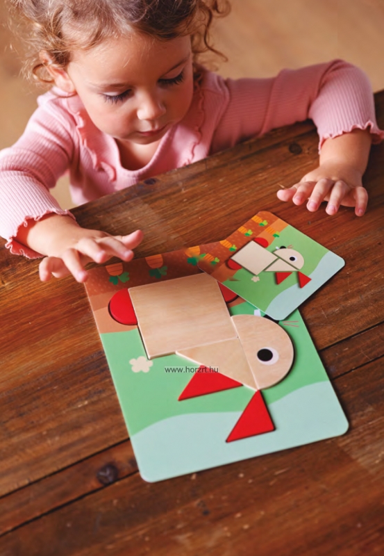 Eleinte tanácsos a kártyák megoldási oldalán lévő figurákat lemásolva játszani, hogy a gyerekek megismerkedjenek a képekkel és a geometriai formákkal.