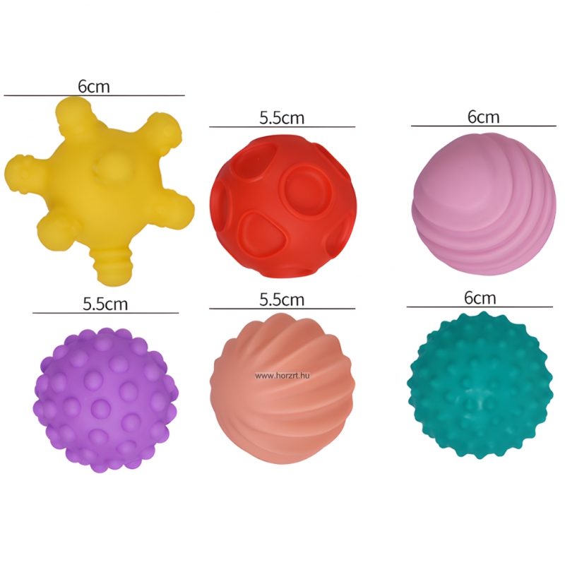 Puha, texturált anyagok. A labdák mérete: kb. 5-6 cm.