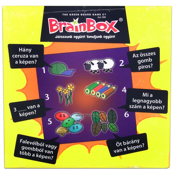 A BrainBox Első képeim remek agytorna és szórakozás, egy vagy akár több játékos részére! Csak a megfigyelőképességed és a memóriád kell hozzá! Koncentrálj és jegyezz meg minél több információt 10 másodperc alatt a kihúzott kártyán lévő képről, majd dobj a kockával és válaszolj helyesen a kidobott szám szerinti kérdésre. De ne húzd az időt, mert a homokórán gyorsan leperegnek a szemek! A válaszokat a kártyán ellenőrizheted. Ha jó megfigyelő vagy és az emlékező tehetséged is kifogástalan, akkor a legtöbb kártya nálad landol!
